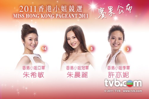 [Click Here] 《2011 香港小姐競選》賽果 冠軍:5號朱晨麗 亞軍:14號朱希敏 季軍:3號許亦妮